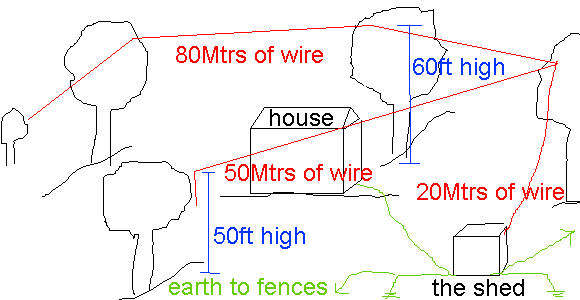 After some refreshment it's down to the serious business of getting the aerial up. I had tried end feeding an inverted L at home and it seemed just as good as the normal tee aerial so I get cracking on that. I want to put the tuning coil in the shed which is in the South corner of the garden. the aerial is to run from there to the North corner. There's a stiff breeze so the arrows I fire keep blowing sideways and looping over the wrong branches. After a few attempts I've got two good anchor points, about 55ft high, for the Southern end of the wire. One of the bootfull of rolls of wire is extracted, a virginal 100M of nice multistrand PVC covered stuff. With enough to reach the shed left dangling the rest is unrolled across the garden, having lobbed the reel over both the electricty and the phone wires of course! It reaches the far corner too easily so I have to cut a few metres off, it'll be too low in capacitance, I'll need extra loading coils, bother.