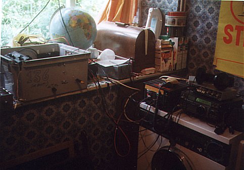 This has been a very tiring day. I've spent the morning driving here and the afternoon running round and round the garden firing arrows into the trees and unrolling cables. I now have an aerial and I have an earth... well, lots of barbed wire connected together anyway. It's time to set up the transmitter.