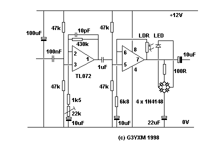 Component Farnell part number Cost ( ex VAT and carriage ) Op amp Chip TL072 401-146 £0.65 Light dependant resistor NORP12 327-700 £1.08 Toshiba yellow ultra-high-bright LED 623-714 £0.74 The resistors are nothing special, 0.4W metal film are OK; the diodes are small signal diodes such as 1N4148 and the capacitors are at least 12V working.