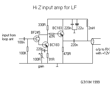 If you want to use a a small multi-turn loop on LF, you will find that the sensitivity is not good enough to receive the weaker signals. A good preamp for a loop needs to have a high input impedance and good signal handling characteristics (to prevent cross-modulation). The circuit shown below is the best I tried and has enabled me to hear Italian amateur signals on the 136kHz band with a 1m diameter tuned loop. The preamp is meant to be mounted outside, near the loop, and is powered down the coax from a 12V supply in the shack. The +12V is applied via another choke at the RX end. A blocking capacitor is also required to prevent 12V being applied to the RX input.