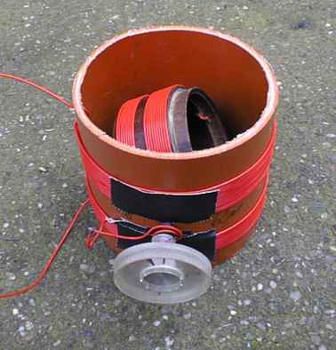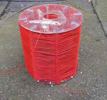 The variometer pictured is made from a piece of 4" diameter plastic pipe ("stench pipe" as I heard it charmingly called ) with another, 3" dia coil able to rotate inside it. The inner coil is wired in series with the outer one and, as it is rotated, it either adds to or subtracts from the total inductance. Mine has a range of 60 to 140uH, more than enough to keep the aerial on resonance in most conditions. Dont use any metal parts (except the wire of course!) in the construction or they will arc, plastic is best and ensure that you can adjust the thing without getting your fingers too close to the wire, RF burns hurt!