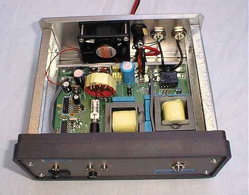Delving inside reveals a well laid-out double-sided PCB onto which all the components are mounted. The output mosfets are clamped to an L shaped heatsink which is in the full draught from a small computer type fan mounted on the rear panel.
